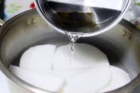 이제 조리용기에 간장, 설탕, 맛술, 물을 섞어 소스를 만들고, 갈치가 볶은 팬에 부어주세요. 고추를 추가하고 덮어서 중불로 끓입니다. 갈치가 익을 때까지 약 10분 정도 끓이면 됩니다.