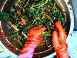신선한 갓이 충분히 절여지면, 양념을 골고루 바르세요. 양념이 고루 배추와 무에 스며들게 해야 합니다. 마지막으로 고추와 멸치를 넣어 완성합니다.
