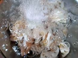 - 냄비에 연근을 넣고 끓여주세요. 연근이 부드러워질 때까지 중불로 조리합니다.